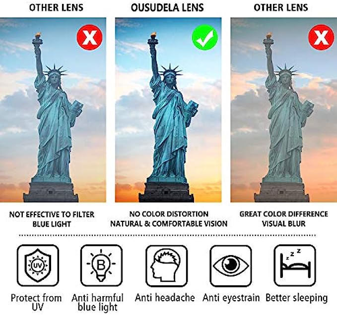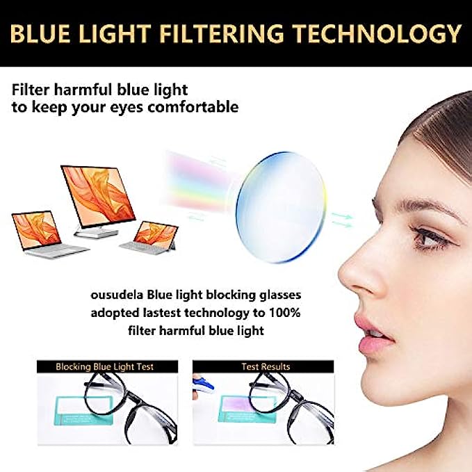 【Blue Light Filter】Ousudela blue light glasses help to filter blue light to reduce eye fatigue, eye strain, blurred vision and headache. Also, improving sleep quality.