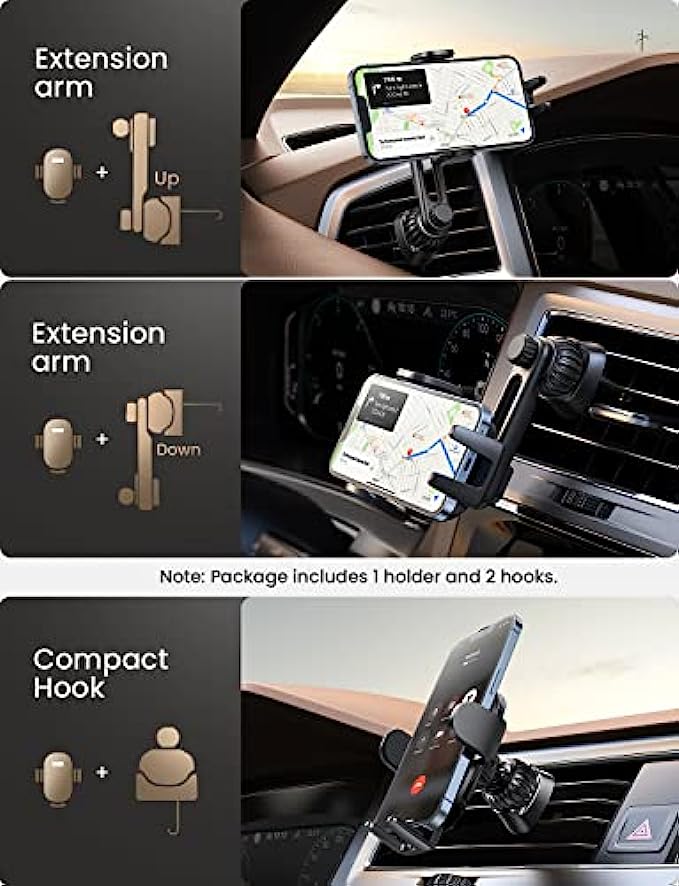 • ?Perfectly Compatible with Horizontal & Vertical Vents: The Steel hook clip of this cell phone mount for car is 50% longer than the ordinary one. It’s compatible with 99% Horizontal & Vertical vents, which solves the common problems of poor compatibility and cradle easy falling off on the market. We upgrade the iPhone car holder to meet all the needs of the car vent. Note: Round vents may not fit.
