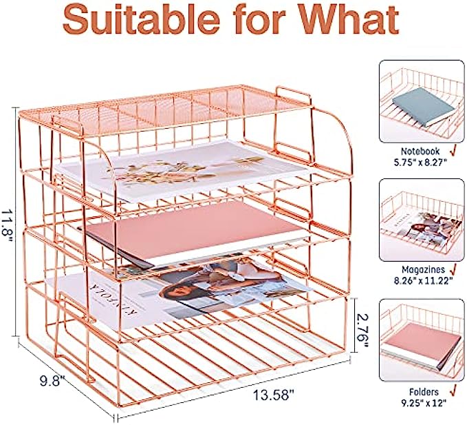• ▶Multifunctional Office Tray- This rose gold desk organizer includes four file trays and one upper display shelf plus a box of binder clips. Large enough to handle daily-used files, papers, letters, files, folders, mail and much more.