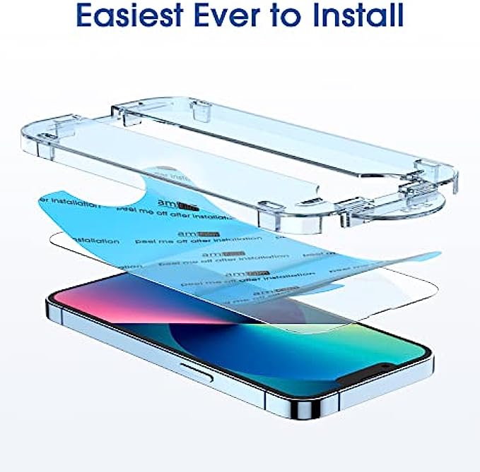 [Patented Auto-Alignment Tech] Perfect installation within 60 seconds! The screen protector is embedded in a plastic frame that fits perfectly over your phone. Set the frame on your phone, swipe down the middle, and done! Watch our Installation Video to see how easy it is to use our Innovative OneTouch Auto-Alignment Screen Protector. [Screen Protector Compatible with iPhone 13 / iPhone 13 Pro 6.1"] Specially designed ONLY for the 6.1 inch models of iPhone 13 / 13 Pro. Not compatible with any other iPhone models. [2 Pack] iPhone 13 / 13 Pro Screen Protectors, two auto alignment tool kits (screen protectors come pre-installed in the auto alignment tool) and two installation accessory kits. [Screen Protection] 0.33mm thick premium tempered glass offers full coverage, scratch resistance, and drop protection for your iPhone 13 / iPhone 13 Pro (6.1'') [Anti-Fingerprint] amFilm tempered glass screen protector for iPhone 13 / 13 Pro is finished with oleophobic coating to reduce fingerprints and provide ultra-clear high definition with 99.9% transparency.