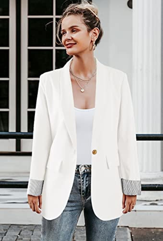 • Design: This is a cute loose fit shawl collar blazer jacket. This classy blazer fits true to size, full lining and has two functional flap pockets, whole solid color with cute striped cuffs and well made , those are easy to creat a professional or casual look! Soft and Comfortable to Wear, Suitable for all seasons especially spring,summer and autumn!