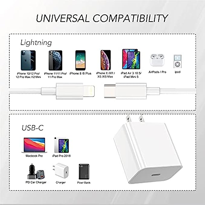 • What You Get:1* fast charging block, 1*6 feet usb c to lightning cable, Welcome guide, 24/7 friendly customer service. Any question or damaged product please do not hesitate to contact us
