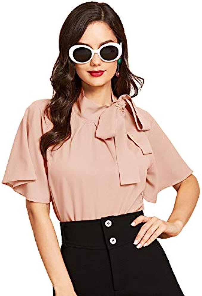 SheIn Women's Casual Side Bow Tie Neck Short Sleeve Blouse Shirt Top