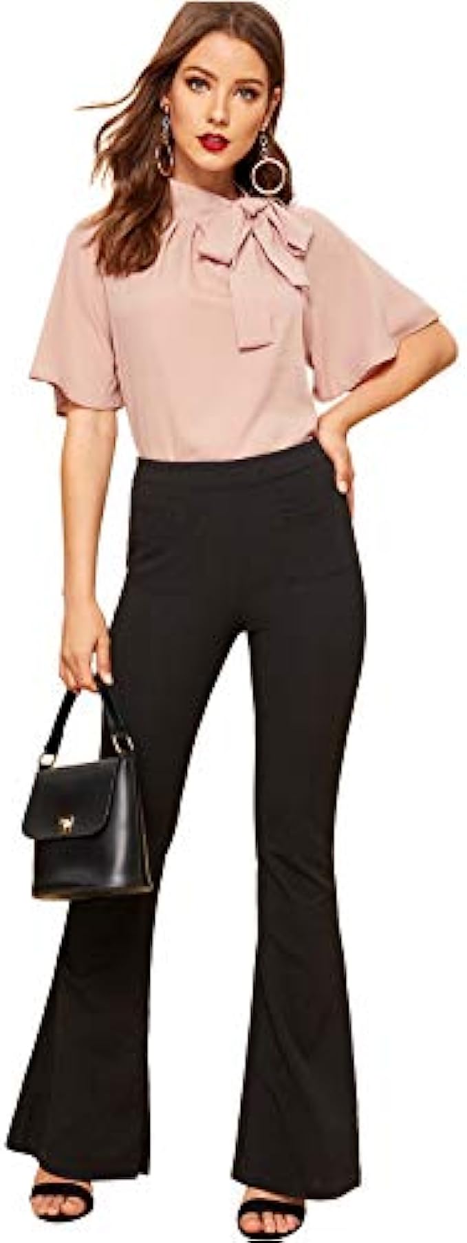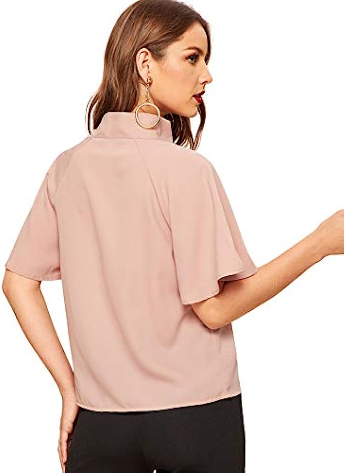 • Side tie neck design at mock neck, lightweight and thin fabric, flutter sleeve, half sleeve, slim fit, retro solid chiffon blouse.