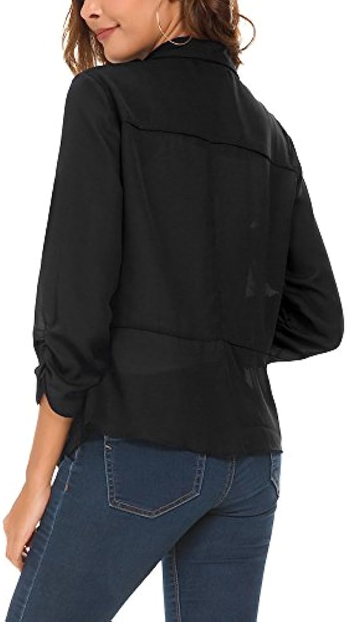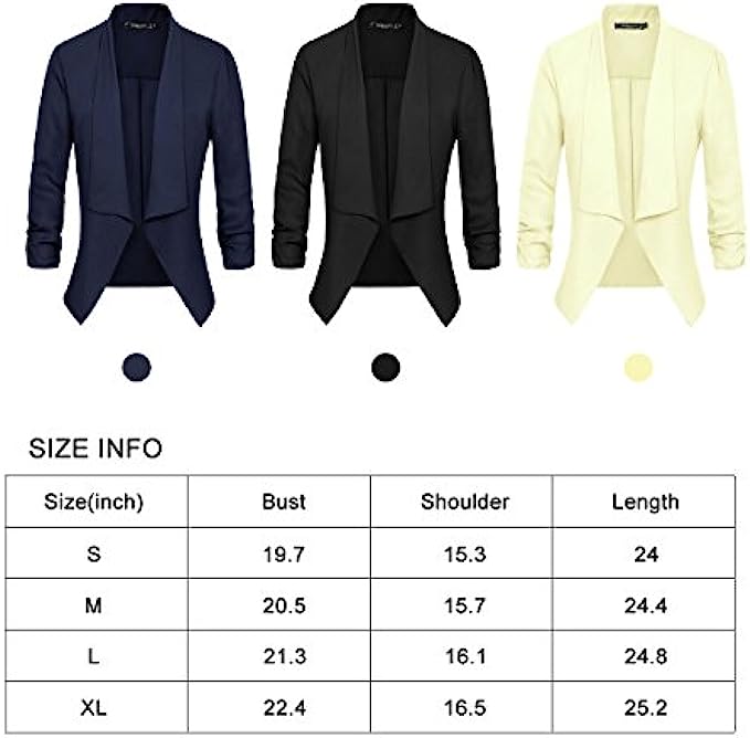 100% Polyester Imported Soft and lightweight fabric which is breathable and comfy and excellent in workmanship,make you feel comfortable for all-day Features 3/4 ruched sleeve blazer, open front, no padded shoulder,uneven vented hem,and notched collar Easy to match clothes,it's super easy to turn any outfit into a classy corporate wear when you have this lightweight chiffon blazer in your closet Great for casual, formal, business wear and other special events. Whether for a casual or a professional look, this blazer jacket makes you cool